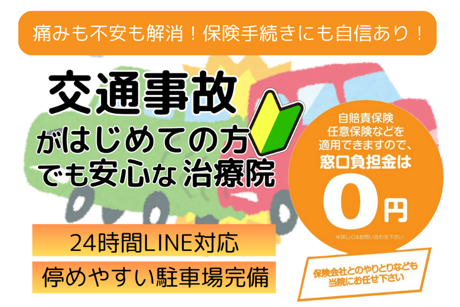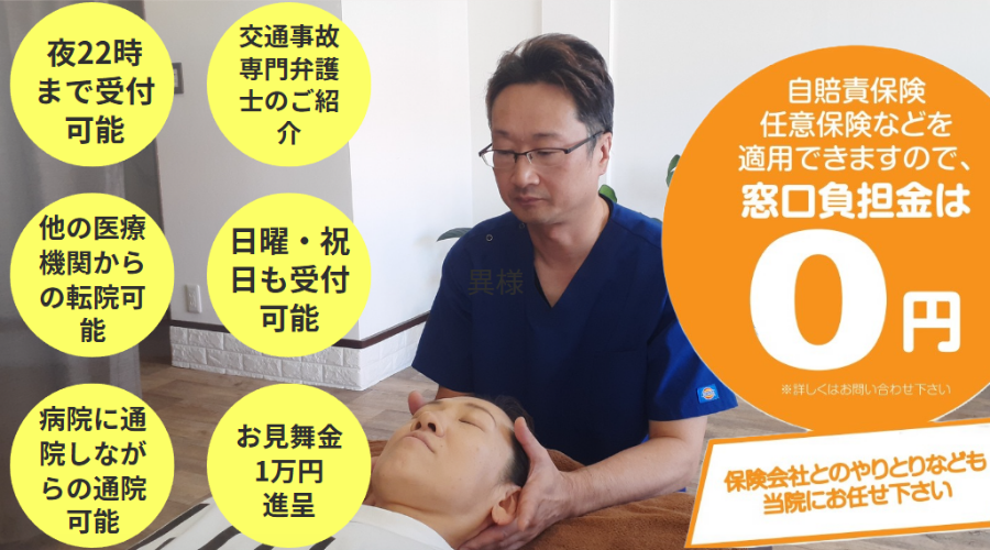 当院にて通院が決まりましたら、ささやかではございますが当該事故に対して、お見舞金(1万円)を進呈させていただきます。